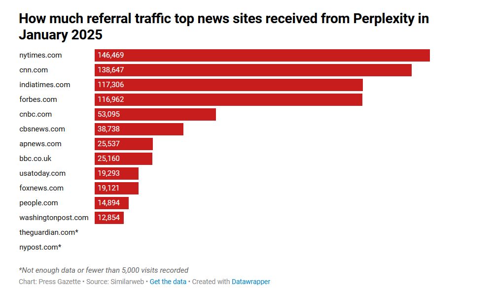 Наибольший трафик от Perplexity пришел на New York Times (146 тыс. посещений), CNN (139 тыс.) и India Times (117 тыс).