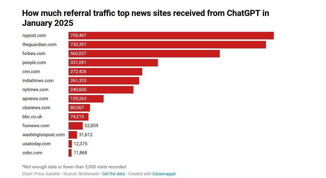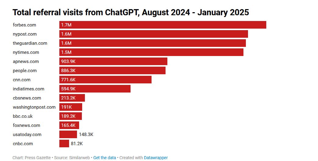 С августа по октябрь 2024 года тремя лидерами по количеству приходов с ChatGPT были New York Times, The Guardian и Forbes. Трафик New York Post начал быстро расти в ноябре, в то время как New York Times, которая в настоящее время подает в суд на OpenAI за предполагаемое нарушение авторских прав, «неожиданно» сократился.