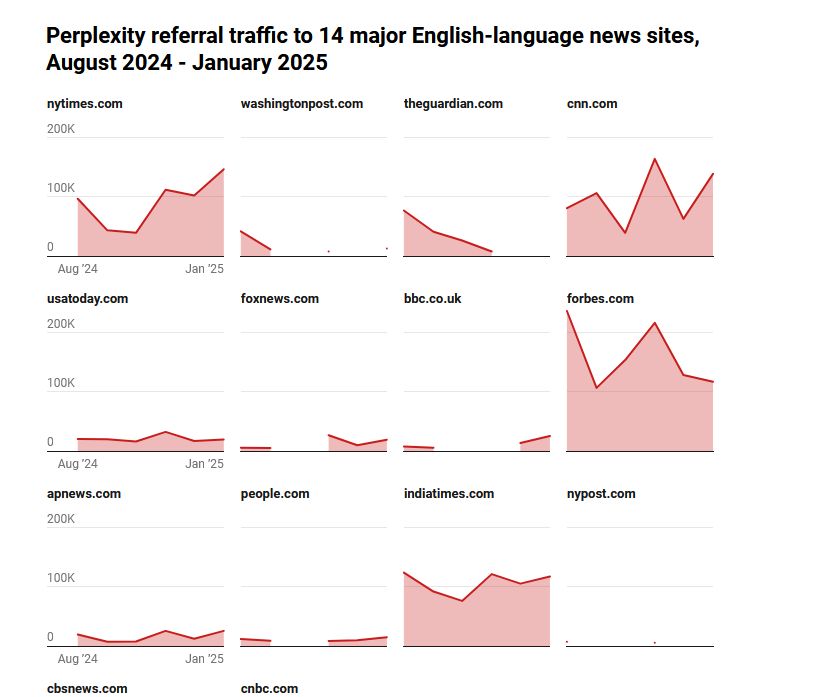 Количество обращений на новостные сайты из Perplexity произошел лишь на нескольких новостных сайтах. У большинства крупных издательств трафик не растет, и даже падает. Авторы отчета пока не могут объяснить это разнонаправленное движение.