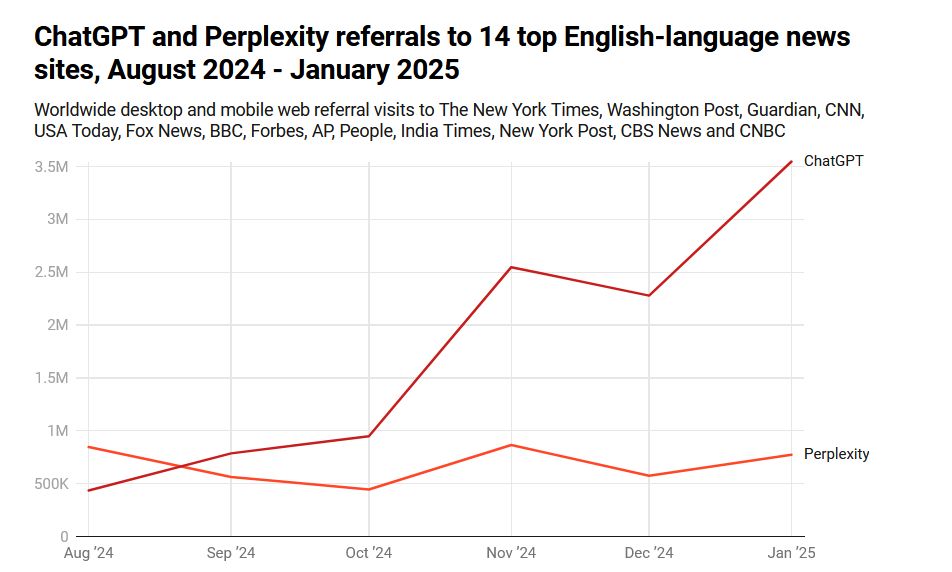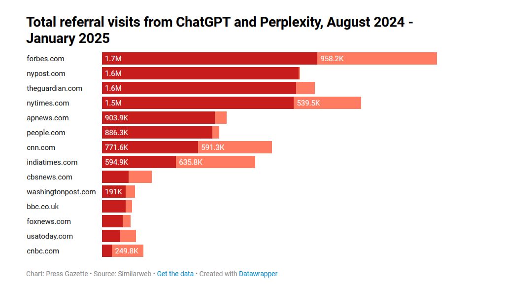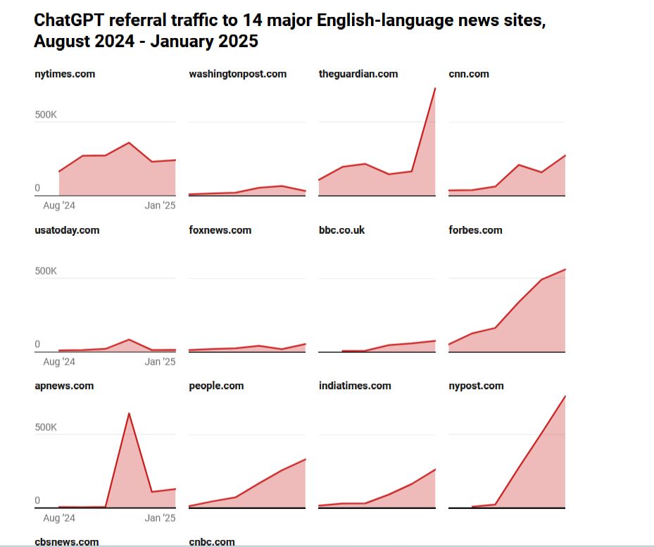 Но пока ИИ-трафик составляет лишь небольшую долю от общего. Трафик крупнейших издательств, попавших в выборку, составил 3,8 млрд в январе 2025 года, таким образом доля посещений с ChatGPT достигла лишь 0,1% от всех посещений New York Times, Washington Post, Guardian, CNN, USA Today, Fox News, BBC, Forbes, AP, People, India Times, New York Post, CBS News и CNBC.