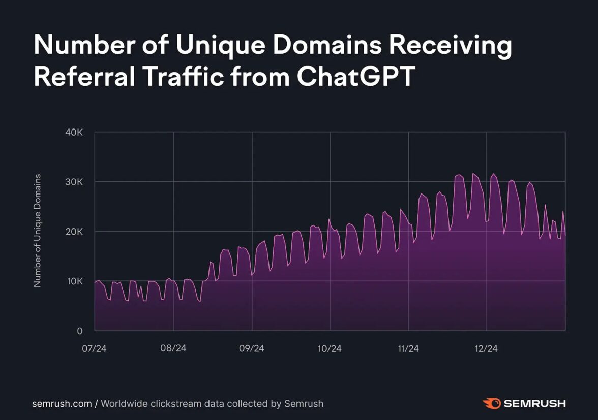 Нейросети являются новым источником органического трафика. По данным Semrush, если в июле 2024 года ChatGPT отдавал по 10 тыс. ссылок на домены ежедневно, то в ноябре прошлого года эта цифра увеличилась втрое — в среднем до 30 тыс. в день.