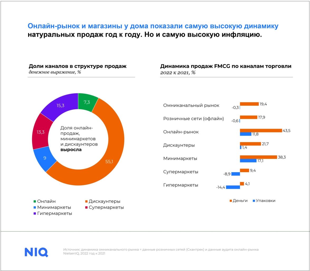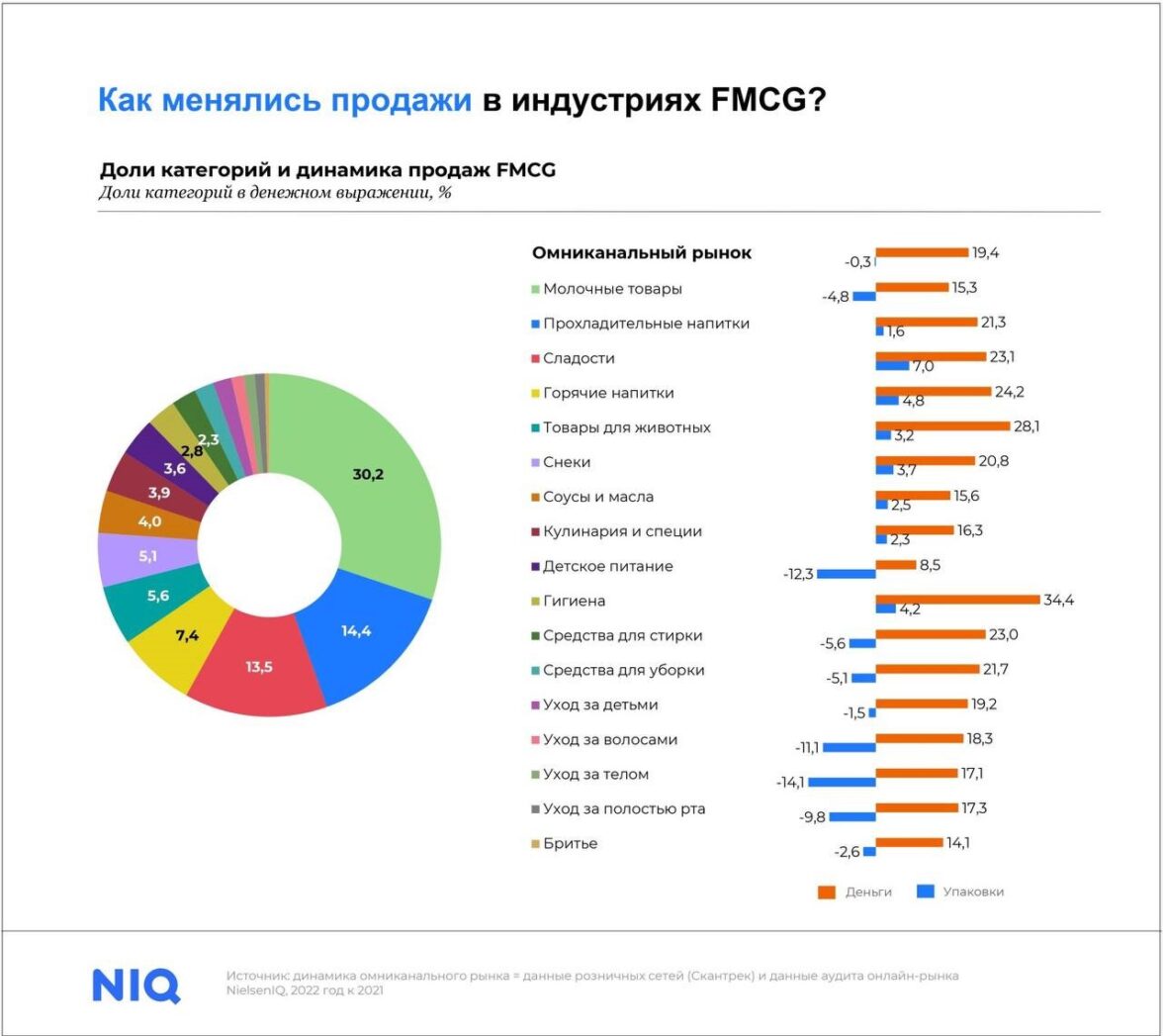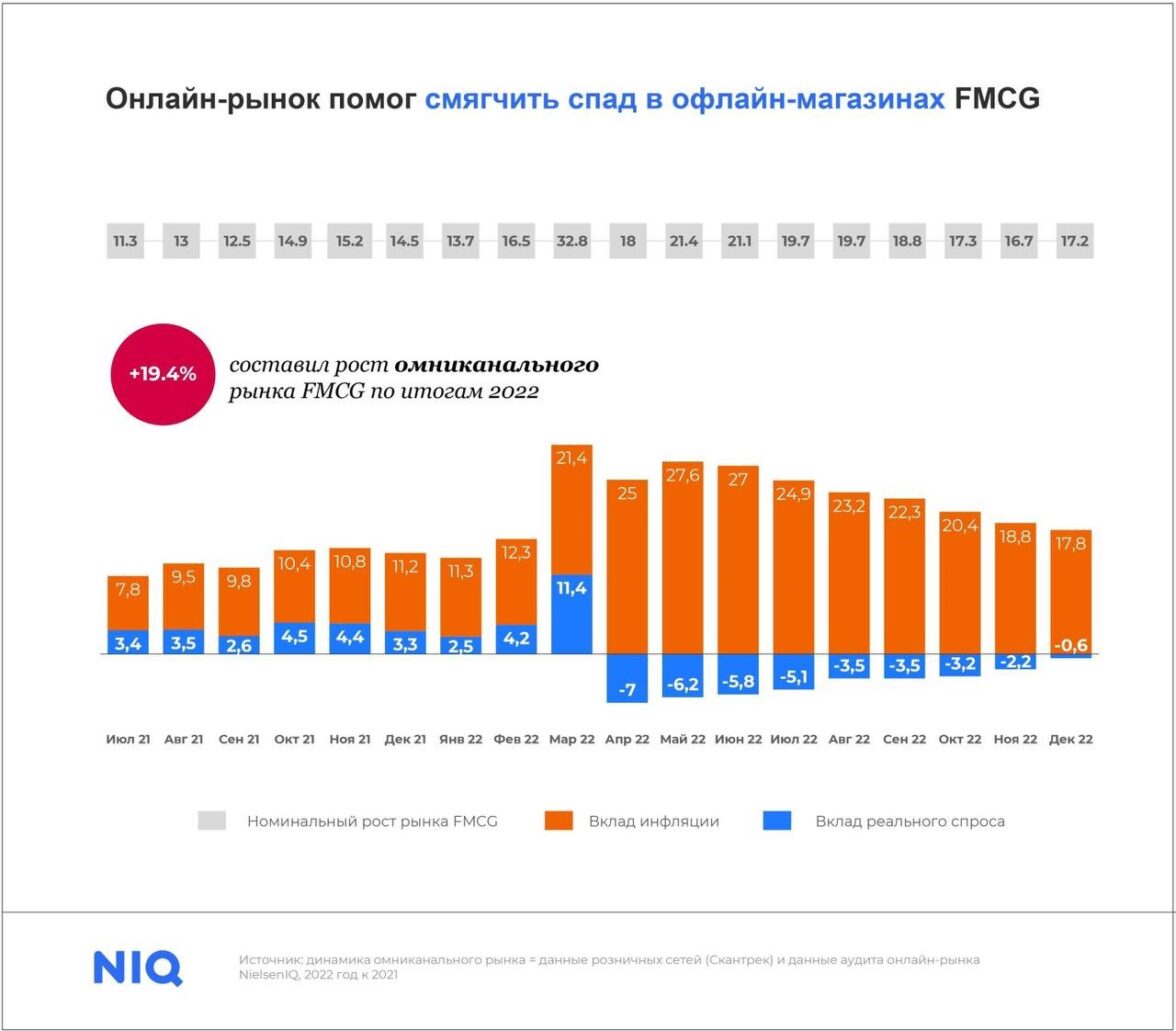 Весь омниканальный рынок товаров повседневного спроса, который включает как онлайн-продажи, так и офлайн-продажи, вырос на 19,4% в денежном выражении к 2022 году. Влияние повышения цен на развитие рынка составил 21%. Кроме того, в то время как рынок развивался в соответствии с реальным спросом до марта 2022 года, потребление товаров резко замедлилось после бурных закупок в апреле. Однако стоит отметить, что наблюдается рост импульсивных покупок, которые можно отнести к покупкам, относящиеся к наслаждению «здесь и сейчас», т.е. когда люди постоянно работают или заняты, и в то же время когда хочется отвлечься и порадовать себя чем-то приятным.