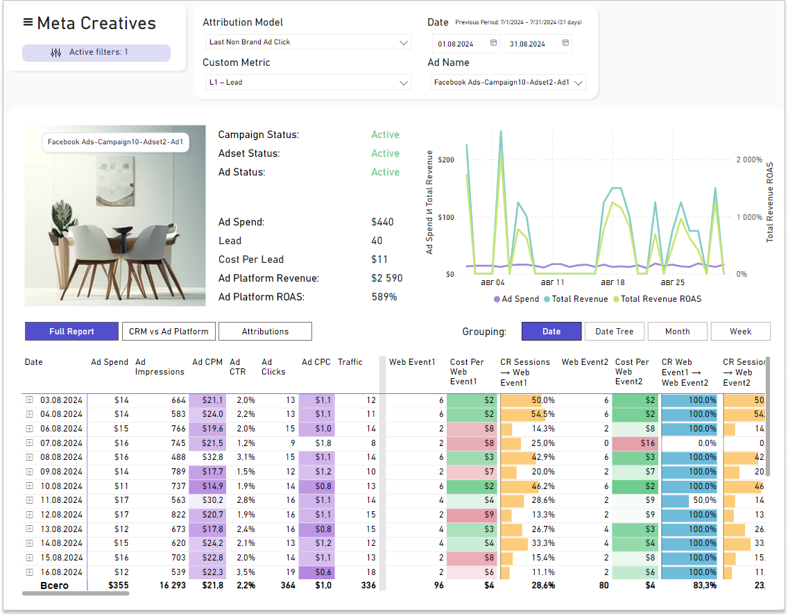 Оценить эффективность конкретного креатива помогут цифры в отчёте: они показывают, сколько денег на него было потрачено и сколько он принес компании, какое количество лидов привел и по какой стоимости