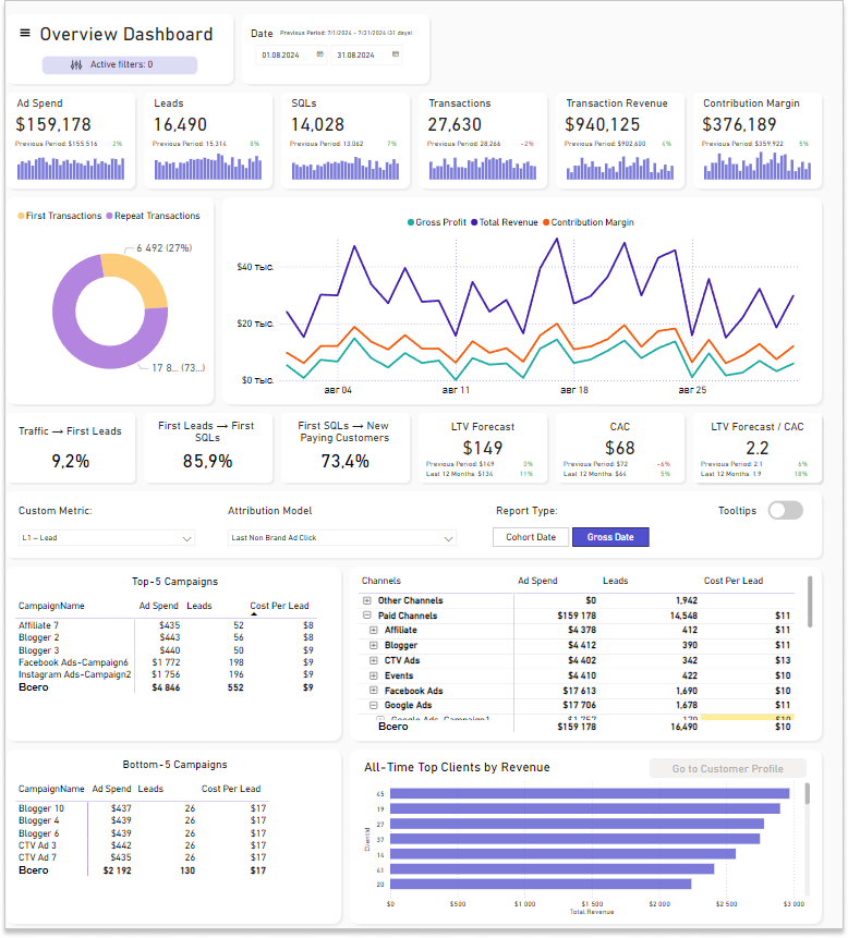 Сквозная отчётность показывает компании достоверные данные от расходов на маркетинг до доходов компании. Система собирает информацию из разных маркетинговых каналов, социальных сетей и систем веб-аналитики, например, Яндекс.Метрики и Google Analytics. Затем объединяет её с данными из CRM и других CPD, ERP-платформ и представляет эту информацию в виде подробных отчётов. Они дают чёткое понимание того, как рекламные каналы и кампании влияют на реальные бизнес-результаты, а не просто считают потенциальных клиентов