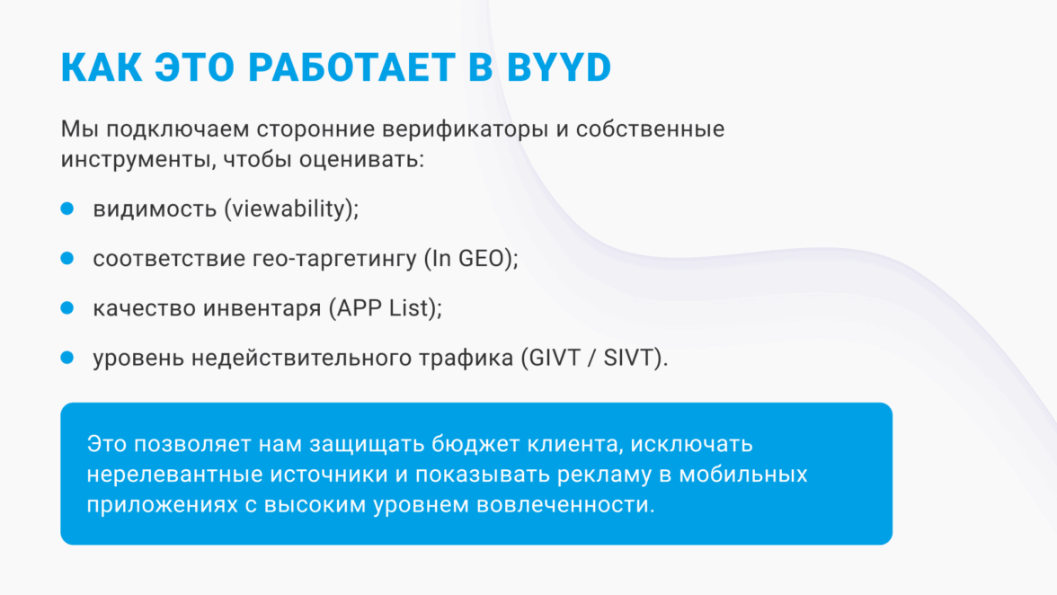 В BYYD мы используем трекинг как инструмент безопасности и эффективности, чтобы каждая кампания приносила максимум выгоды, а бренд был уверен в качестве каждого показа.