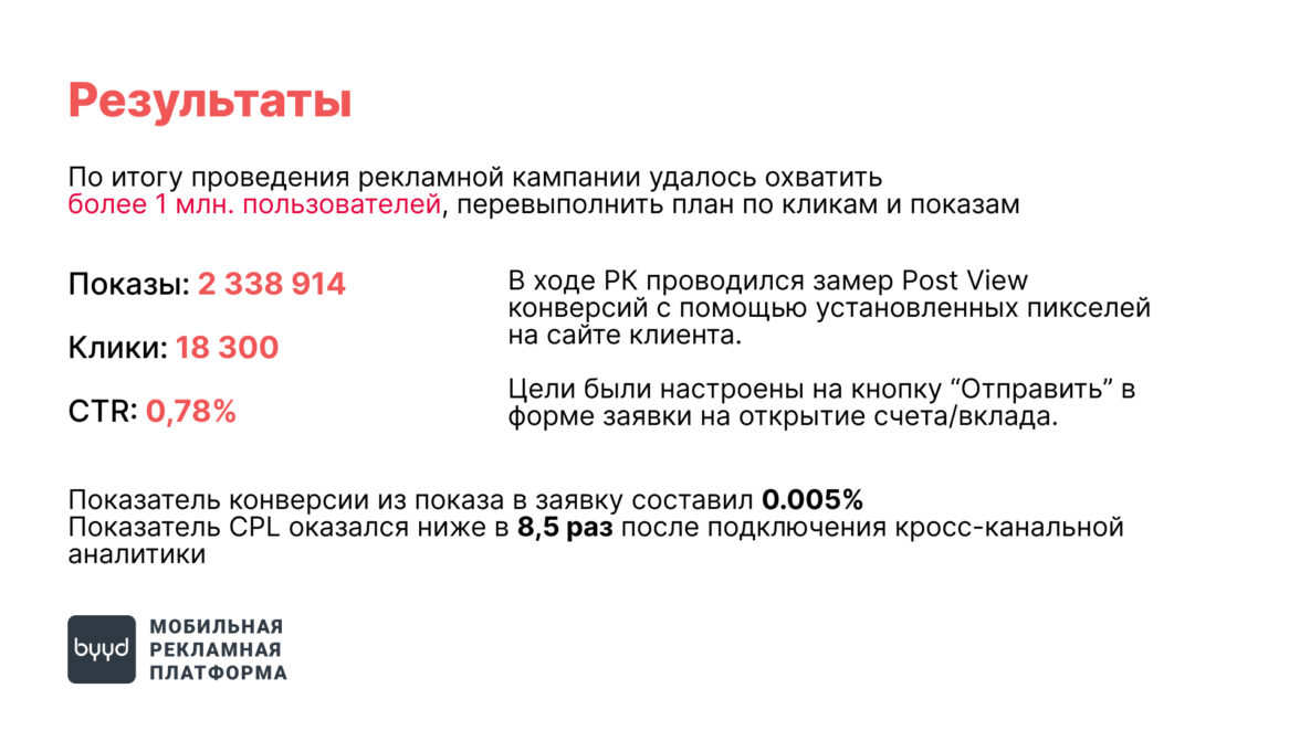 Особенно важно, что пост-вью-конверсии, измеренные с помощью тегов Adriver/Weborama, показали конверсию из показа в заявку на уровне 0,005%.