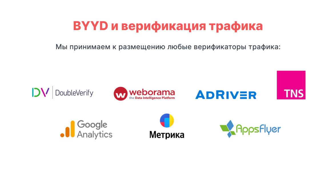 Мы уделяем особое внимание качеству и прозрачности трафика и активно работаем с проверенными трекерами и сервисами верификации, такими как Weborama, Adriver, Double Verify и другими.