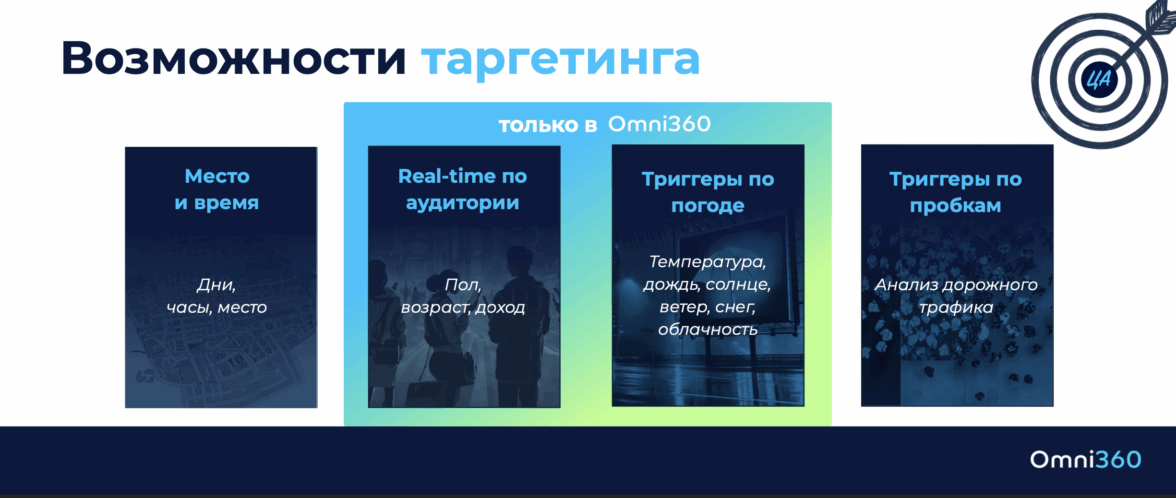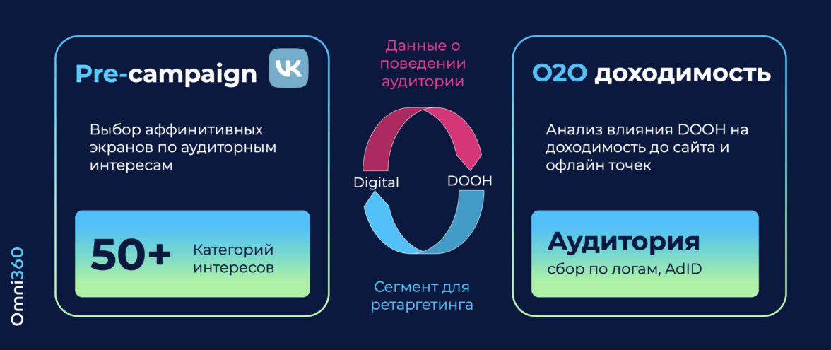 Объединение физического и цифрового пространств в коммуникациях с аудиторией дает возможности, привычные digital индустрии: от таргетированного охвата по аудиторным данным и сбора post campaign отчетности — до построения аудиторных сегментов среди тех, кто находился в зоне видимости цифровых экранов на улице с возможностью «догнать» их онлайн и повысить CTR в последующих digital РК.