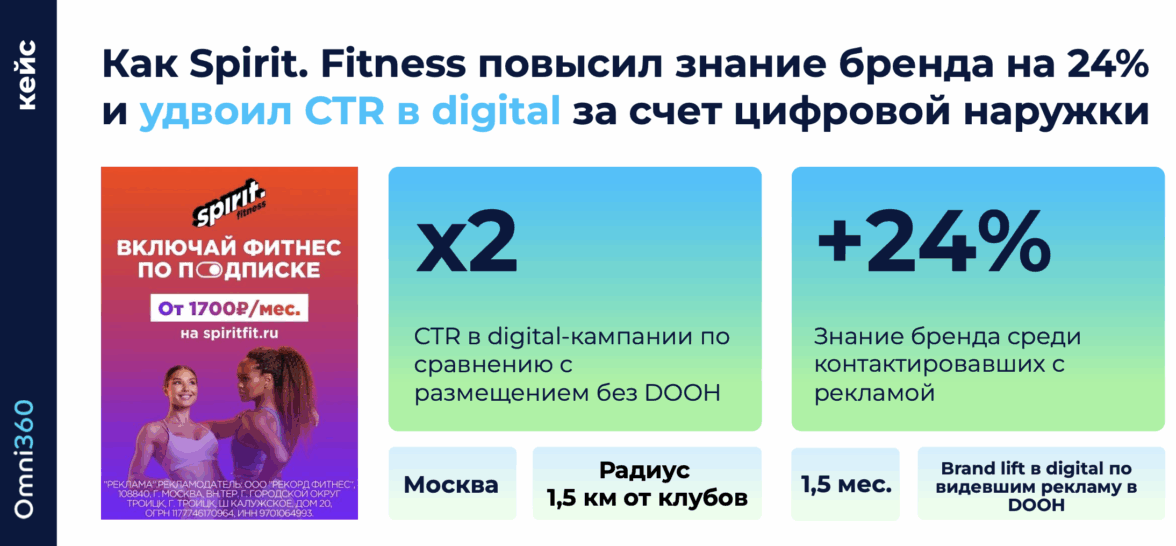 Например, в кампании Spirit.Fitness, которая проводилась агентством Traffic (часть Okkam) через DSP-платформу Omni360 — аудитория, контактировавшая с рекламным сообщением в DOOH, использовалась для построения сегмента ретаргетинга в медийных digital-каналах. Результатом стало значительное повышение CTR в digital кампании.