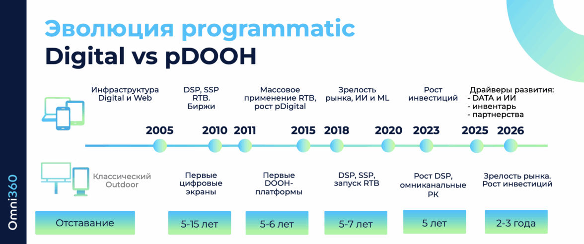 По данным Admetrix, затраты на DOOH выросли на 112%, а доля цифровой наружной рекламы превысила 70% от всех инвестиций в Out-of-home еще в 2024 году.Цифровизация инвентаря полностью трансформировала классическое медиа: DOOH стал современным, гибким и доступным инструментом, работающим по правилам digital-рынка. Еще несколько лет назад programmatic-закупки в наружной рекламе были единичными, а сегодня разрыв между programmatic Digital и programmatic Digital Out-of-home сократился с 5–7 лет до 2–3 лет, а в скором времени наступит зрелость этого сегмента.По данным крупнейшего оператора RWB, в 2025 году доля programmatic-закупок DOOH достигла около 30%, что в 3 раза выше среднемирового уровня.