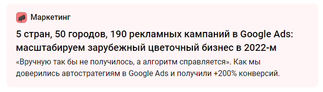 Мы, например, рекламировали свою услугу контекстной рекламы для ниши онлайн доставки цветов. Это довольно небольшой сегмент аудитории относительно всей аудитории VC.