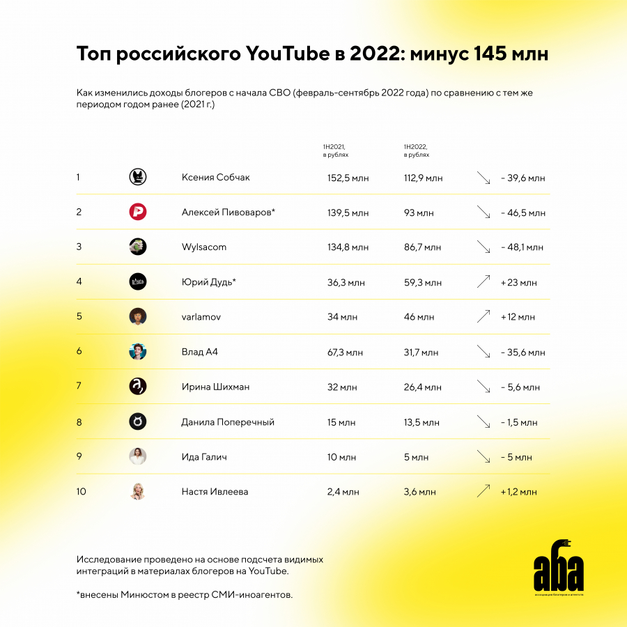 Согласно источнику, главный удар от падения рекламных вложений в рынок придётся на блогеров до 500 тыс. подписчиков, считают в АБА: «Для них намного болезненней стала потеря доходов от самой площадки, а находить рекламодателей им сложнее, чем крупным каналам с большими командами и налаженными связями».