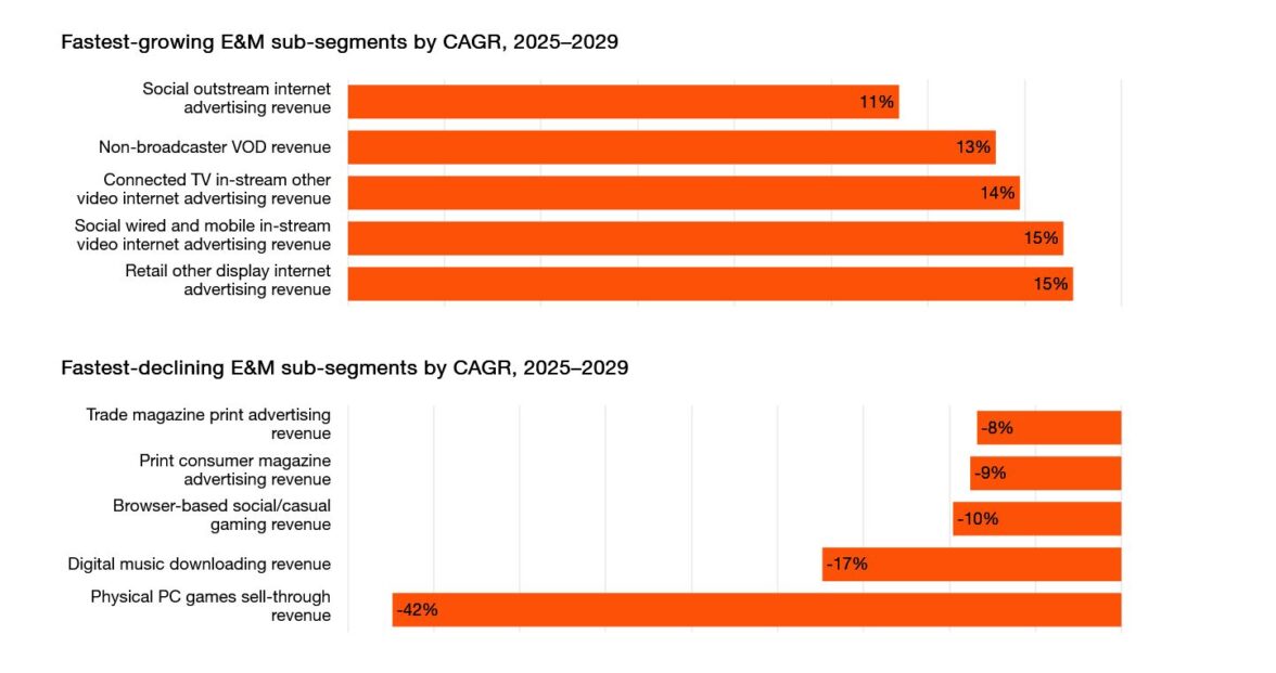 Темпы роста выручки в сфере развлечений и медиа падают каждый год после взлета в пандемию коронавируса Covid-19 в 2020 году, они будут постепенно снижаться в течение следующих пяти лет. PwC связывает снижение динамики роста с продолжающимися ограничениями на потребительские расходы, вызванными экономической неопределенностью, торговыми войнами и общим замедлением мировой экономики.