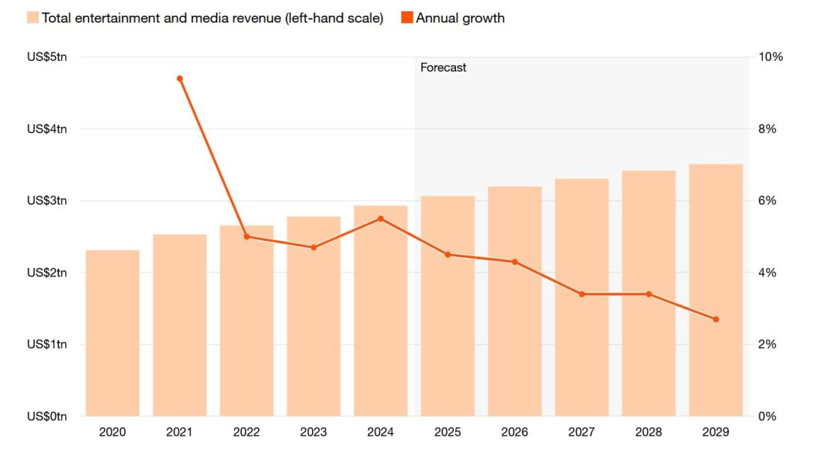 Выручка глобального рынка развлечений и медиа (E&M) в 2024 году выросла на 5,5%, до $2,9 трлн. В ближайшие годы рынок будет расти в среднем по 3,7% и по итогам 2029 года достигнет $3,5 трлн, прогнозирует PwC.