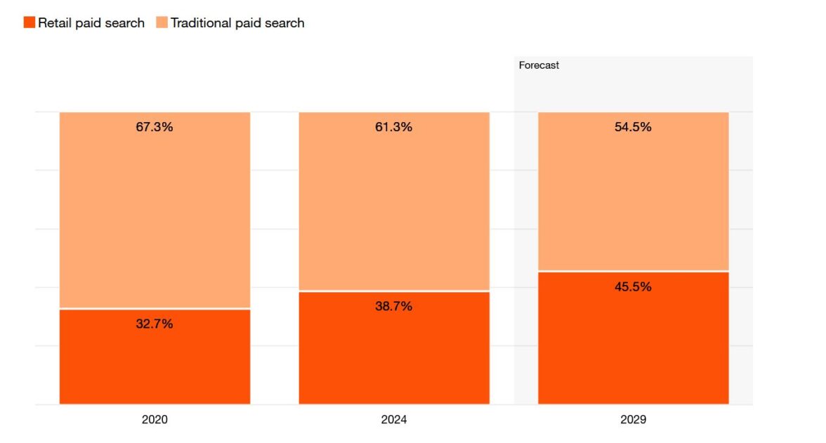 Ритейл-медиа отъедают долю у поисковиков. По прогнозу PwC, в 2029 году e-com заберет себе 45,5% бюджетов рекламодателей в платном поиске.