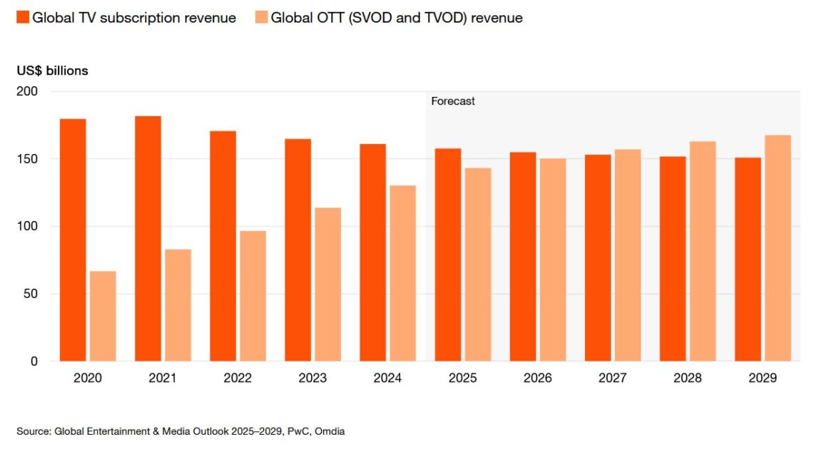 Рекламная модель монетизации видеостримингов (AVOD) будет увеличивать долю — с 20% в 2020 году до 27,1% в 2029-м. В 2027 году будет пройдена точка невозврата, когда глобальные доходы ОТТ-видеосервисов впервые превысят доходы от платного ТВ — $157 против $153 млрд соответственно.