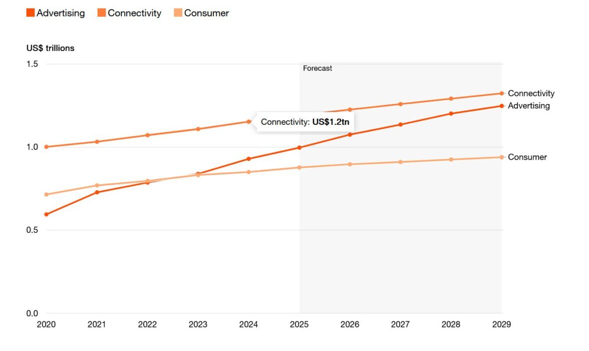В 2024 году впервые глобальные доходы от рекламы превысили потребительские расходы в сфере развлечений — $900 млрд против $800 млрд. PwC ожидает, что разрыв между этими двумя категориями будет увеличиваться: расходы на рекламу будут расти в ближайшие пять лет в три раза быстрее — по 6,1% в год против 2% у развлечений. К 2029 году расходы на рекламу перерастут потребительские затраты на развлечения на $300 млрд. Объем мирового рекламного рынка вырастет до $1,2 трлн, индустрии развлечений составит $900 млрд.