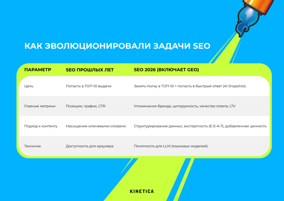 GEO (Generative Engine Optimization) — это не замена SEO и не отдельная услуга, а новый стандарт качества внутри классического продвижения (подробнее). Если раньше мы оптимизировали сайт, чтобы робот мог его проиндексировать, то теперь мы оптимизируем его, чтобы нейросеть могла его «понять» и использовать в ответе. Фундамент (техническая база, скорость, семантика) остается прежним, но требования к структуре данных становятся жестче.