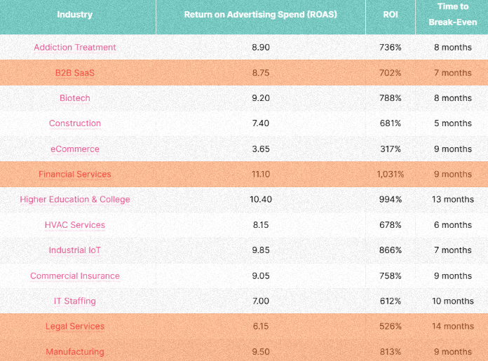 Немного статистики: финансовый сектор достигает ROI на уровне 1031% с возвратом инвестиций примерно за девять месяцев; производственные компании получают 813% при тех же сроках окупаемости; B2B SaaS демонстрирует 702% с возвратом через семь месяцев; юридические услуги показывают ROI 526% при конверсии 7,5%.