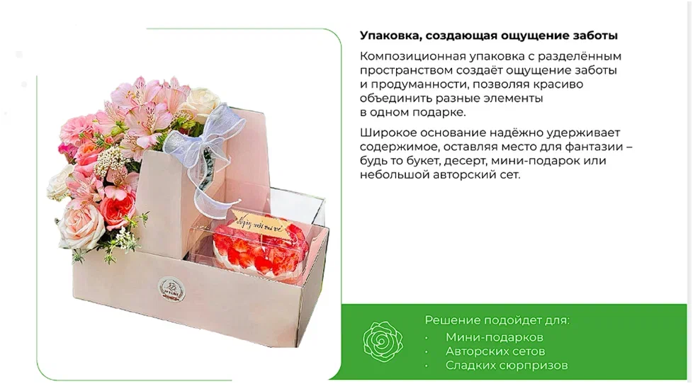 Для 8 марта нужна другая тональность: больше воздуха, мягкие пропорции, легкость, с которой открывается коробка. Здесь важна не столько демонстрация содержимого, сколько атмосфера — ощущение заботы, почти тактильное удовольствие от прикосновения к упаковке. Такой подарок хочется держать в руках, рассматривать и медленно раскрывать.