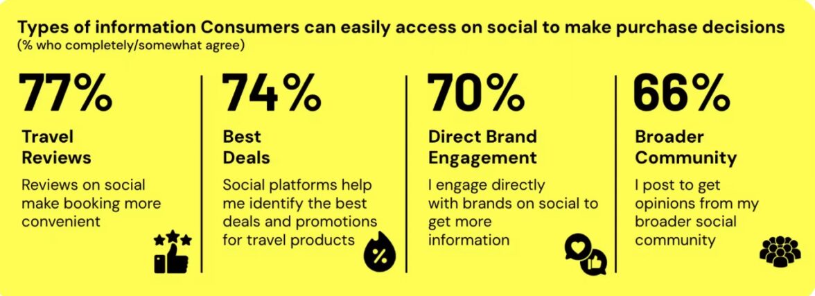 77% опрошенных согласились с утверждением, что отзывы в соцсетях делают более удобным тревел-шопинг. 74% респондентов с помощью соцсетей находили лучшие спецпредложения и скидки. 70% опрошенных связывались в соцсетях напрямую с представителями туристических брендов. 66% респондентов обращались к сетевому сообществу, чтобы узнать мнение других людей о чем-то, связанном с путешествиями.