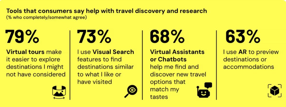 Так, виртуальные туры помогают 79% путешественникам узнать о возможных направлениях поездки, которые они в противном случае не стали бы рассматривать. 73% опрошенных использовали визуальный поиск, чтобы найти что-то похожее на те места, где они уже бывали и где им понравилось. Виртуальные помощники и чат-боты помогли 68% путешественников найти что-то новое, соответствующее их вкусам. 63% опрошенных использовали технологии дополненной реальности при просмотре будущих направлений поездки и (вероятно, чаще) выборе отеля.