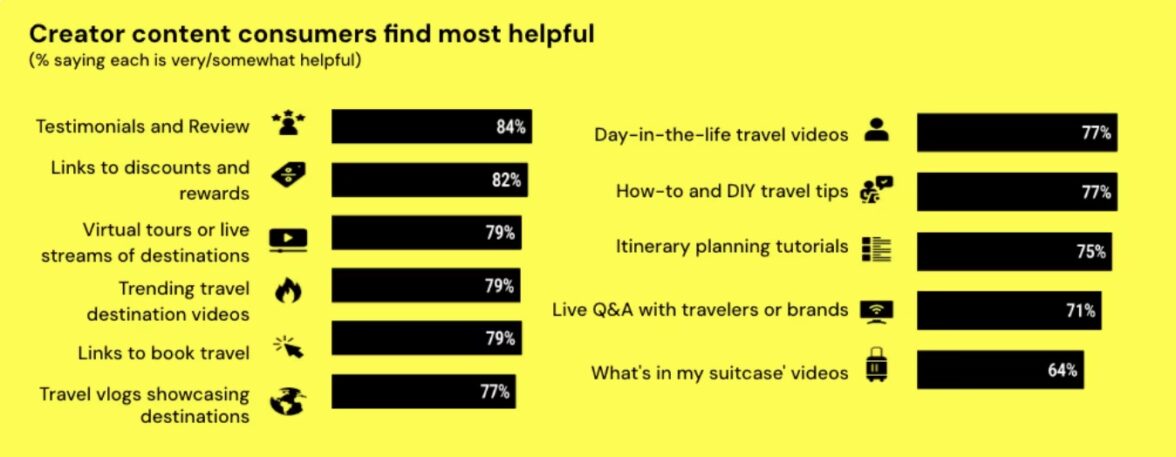 84% путешественников считают полезными обзоры и отзывы креаторов. 82% находят пользу в ссылках, дающих возможность получить скидки и какие-то вознаграждения. 79% опрошенных нравятся стримы и виртуальные туры. Такой же процент респондентов считает полезным видео о трендовых направлениях и ссылки на бронирование турпродукта. 77% респондентов считают полезным влоги о путешествиях, видеобзоры в формате «день в жизни путешественника» и рекомендации по планированию расписания поездки. 71% опрошенных находят полезными ответы брендов и путешественников на заданные им вопросы. Замыкают первую десятку полезной информации видео на тему «а что у меня в чемодане».