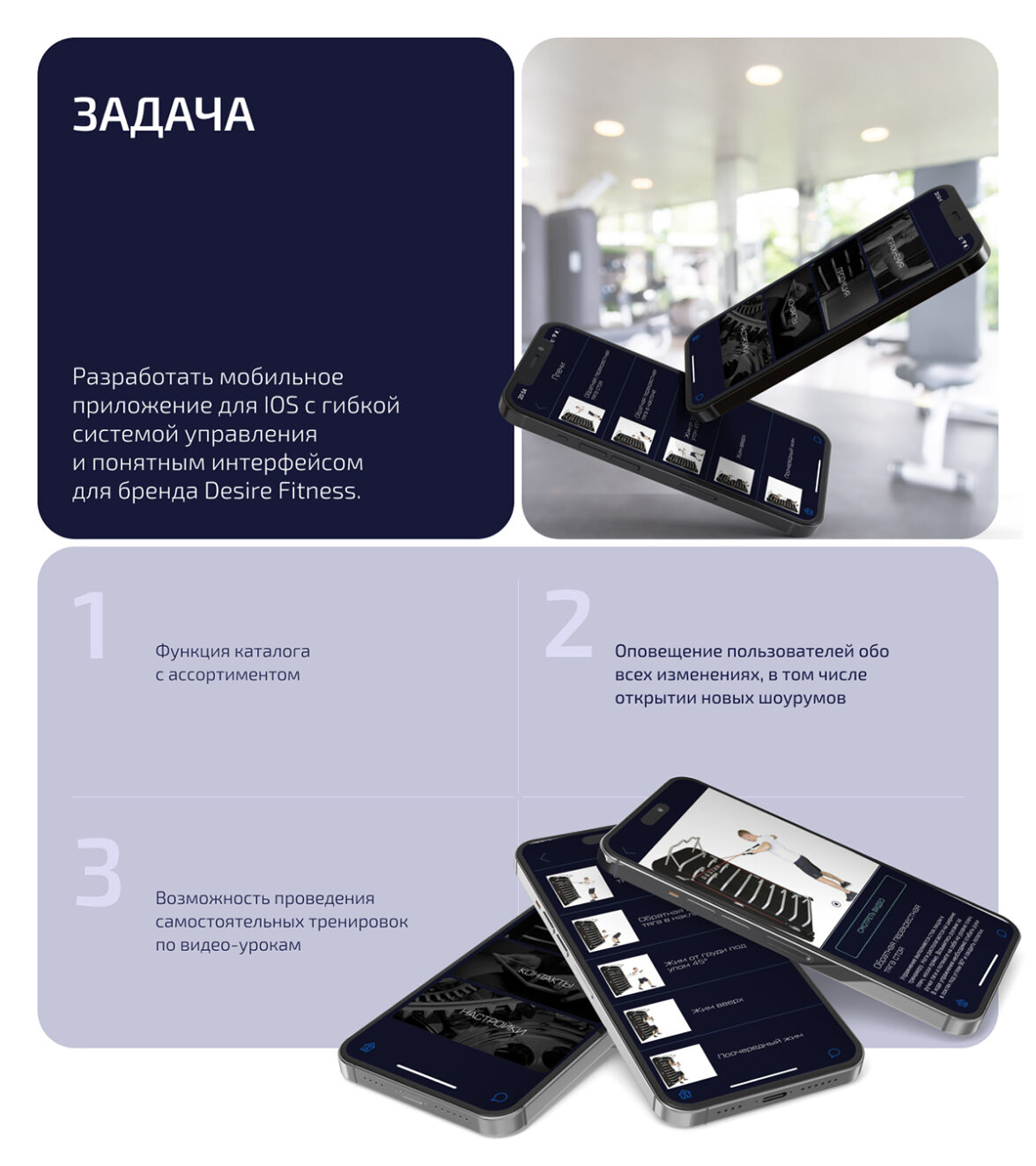 • Разработать гибкую систему управления: Сотрудники Desire Fitness должны иметь возможность самостоятельно управлять приложением и при необходимости изменять некоторые блоки.