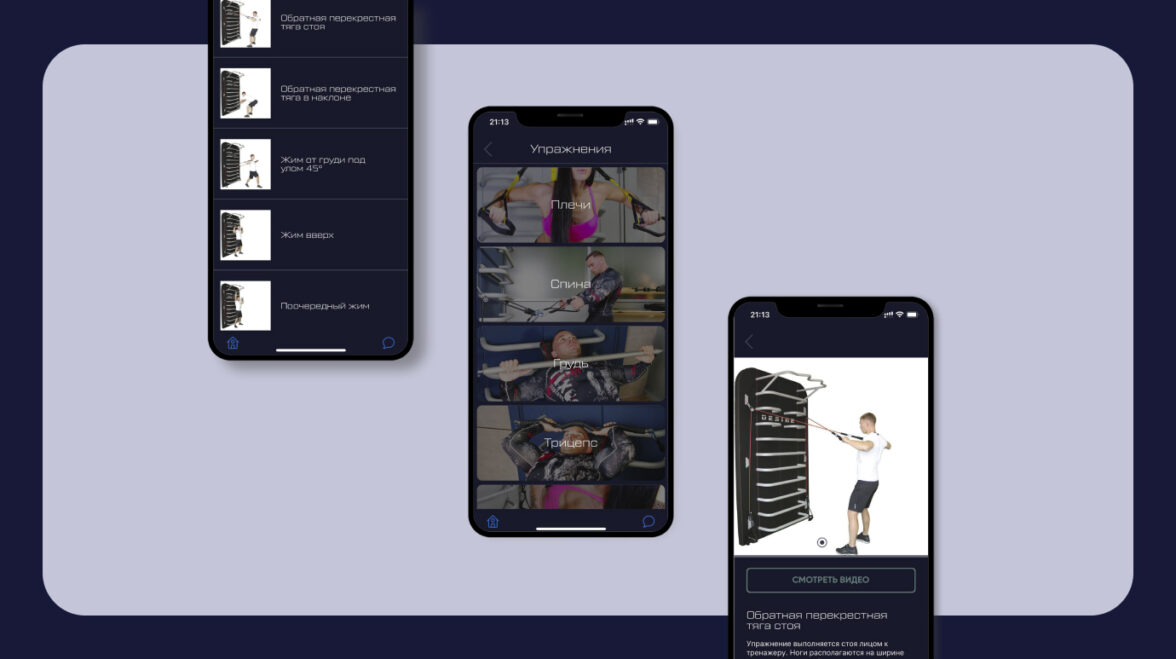 Блок представляет собой каталог упражнений на разные группы мышц с использованием тренажеров бренда. Внутри каждой категории мы разместили пул упражнений с текстовым описанием и видеоинструкцией. При желании пользователь может воспользоваться функцией скачивания видеоматериала для просмотра в оффлайн режиме.