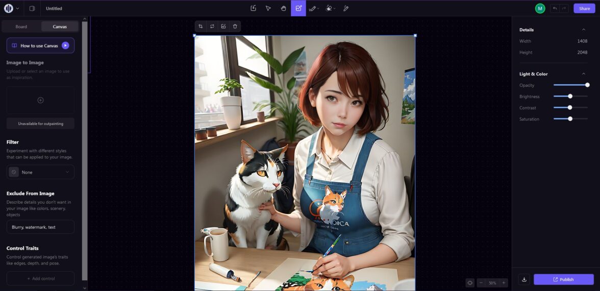 В режиме Canvas генерация изображения выполняется или автоматически выбираемой моделью, или Stable Diffusion XL. Подробно, как генерировать изображения, писать не будем — общие обзоры сервиса есть, в том числе на VC. Если коротко: создание картинок выполняется на основе базового набора стандартных для Stable Diffusion настроек.