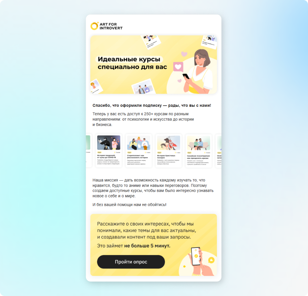 Главная задача такой рассылки — привлечь внимание читателя и вызвать интерес к продуктам компании. Она автоматически отправляется после подписки через веб-форму, регистрации на сайте или загрузки бесплатного материала, доступного по подписке.