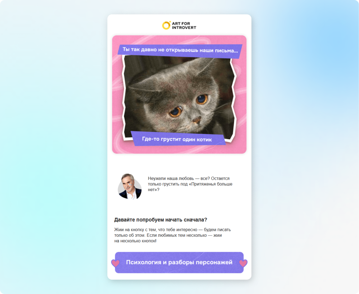 Основная цель реактивационных писем — вернуть прежний интерес пользователя. Они срабатывают, когда клиент перестаёт проявлять активность. Например, несколько месяцев не заходит на сайт или не открывает письма от вашего бренда.