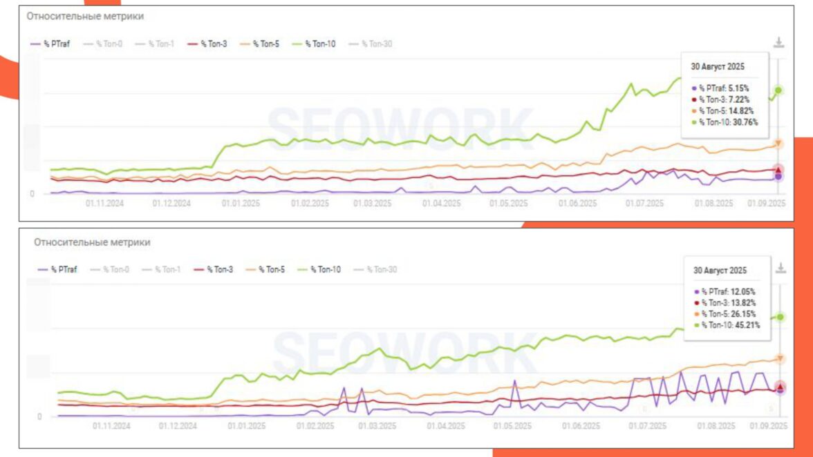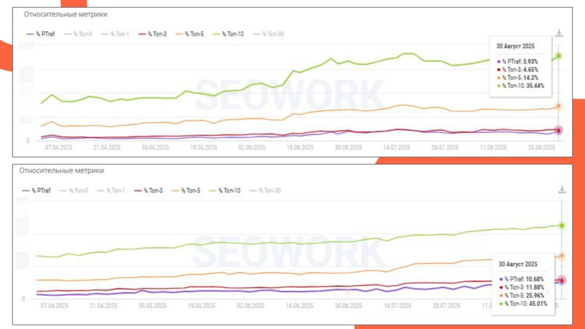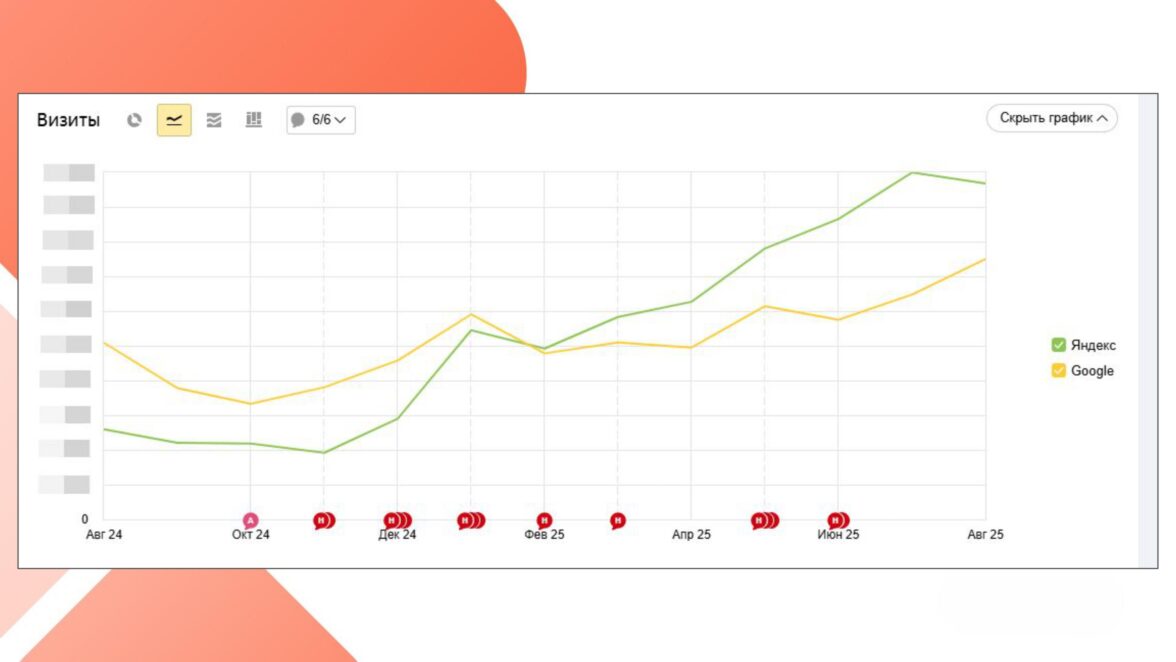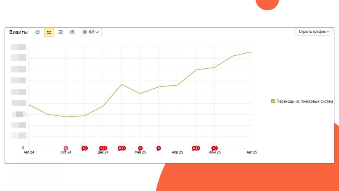 Особенно заметный рост наблюдается с апреля 2025 года — в этот период мы расширили семантику и добавили новые запросы.