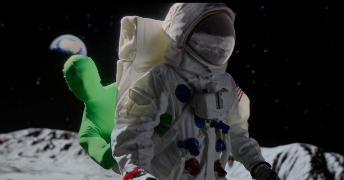 Человек в зелёной одежде на съемках чаще всего носит костюм или одежду зелёного цвета для работы с технологией хромакей (green screen). Этот костюм позволяет при постобработке заменить зеленые участки на любые цифровые изображения или эффекты — например, создать иллюзию полёта, телепортации, исчезновения или перемещения в виртуальные миры. Зеленый цвет выбран потому, что он резко отличается от цвета кожи и большинства предметов, что облегчает его удаление при монтаже. Никаких следов на экране.