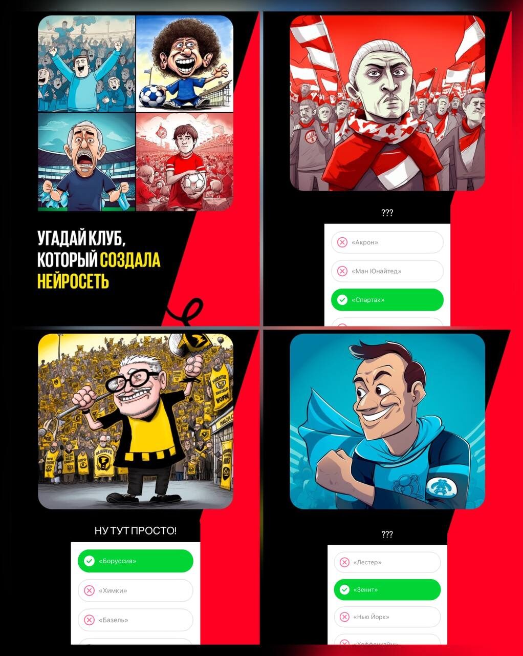 Наши гении из SMM устроили себе выходной и заставили ИИ производить весь контент: это порядка 50 публикаций в социальных сетях. Ярким дополнением постов стали изображения, сгенерированные нейросетями. В сторис в Instagram* прошла викторина, где подписчики должны были угадать, какой клуб сгенерировала нейросеть.