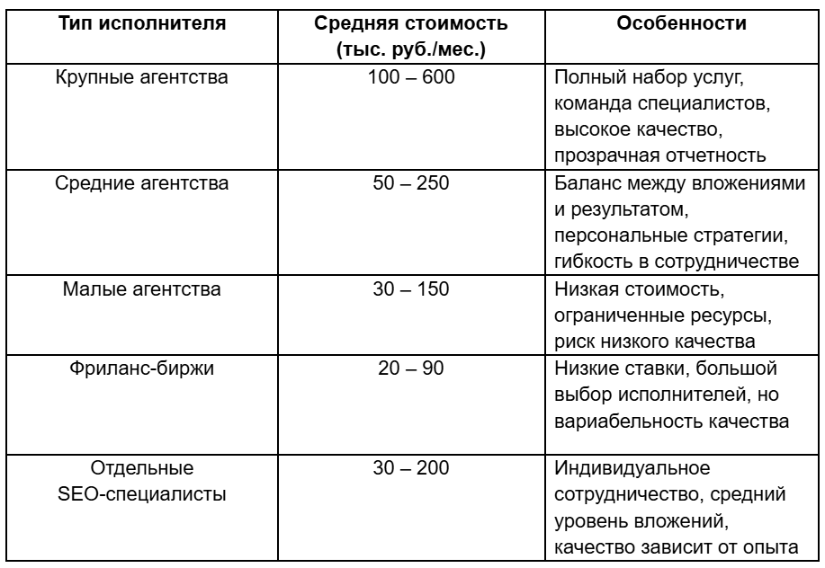 Средняя стоимость SEO-продвижения в зависимости от исполнителя:
