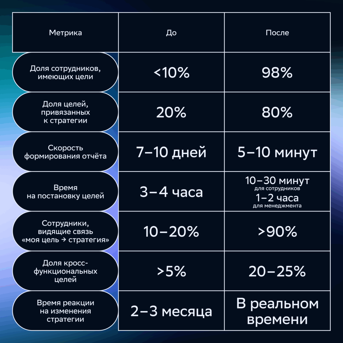 Цифровая трансформация целеполагания — это не про отказ от табличек в Excel, а про создание работающего механизма, где стратегия воплощается в ежедневных действиях каждого сотрудника. Управление стратегией может быть прозрачным и технологичным, это подтверждают результаты кейса СберМаркетинга. Наш модуль — цифровая экосистема, где каждый шаг сотрудника приближает компанию к результату. Мы последовательно используем инновации в операционке: внедряем технологии, которые автоматизируют рутину и освобождают время команды для стратегической работы. Следующий шаг — развитие модуля с помощью искусственного интеллекта, который будет анализировать цели на соответствие SMART-критериям, находить дубли и слабые формулировки, подсказывать, как сделать KPI точнее и измеримее, — это новый уровень data-driven-управления.