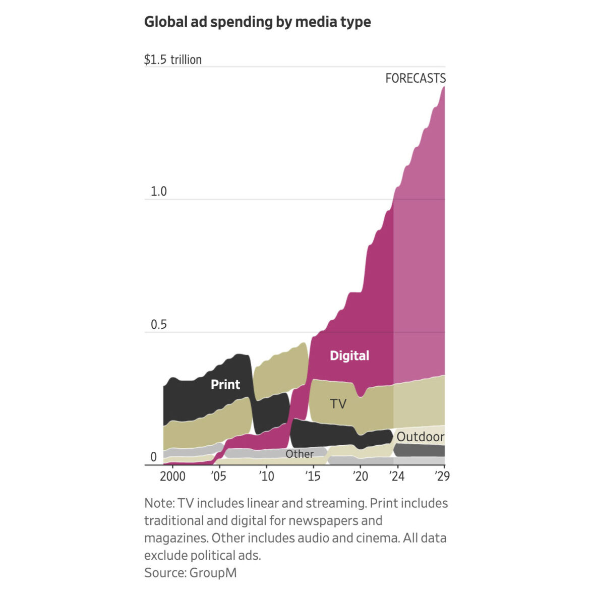 На диаграмме видно, как цифровая реклама за десять лет стала крупнейшим сегментом рынка © The Wall Street Journal