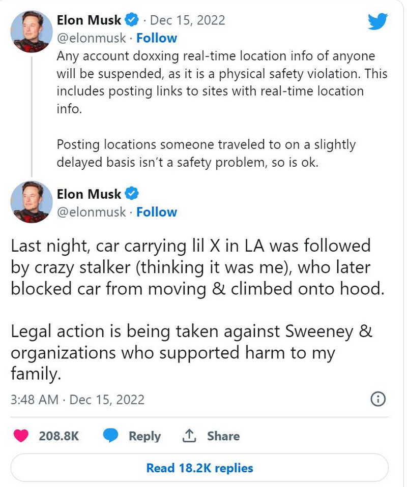 Через несколько часов после бана аккаунта @ElonJet, где в реальном времени можно было отследить местонахождение личного бизнес-джета Маска, Twitter заблокировал и аккаунт создателя этой учетной записи Джека Суини, а также десятки других учетных записей, которыми Суини управлял. Через час Суини удалось разбанить @ElonJet, но Twitter снова заблокировал следящий аккаунт.