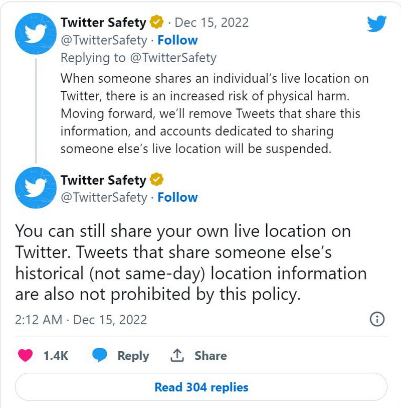 Одновременно Twitter обновил свою политику в отношении конфиденциальной информации, заявив, что передача данных о местоположении в реальном времени является нарушением этой политики. В пояснении к ее изменению Twitter сообщил, что твиты, содержащие данные о реальном местоположении, уже удалены с платформы, а аккаунты, предназначенные для этого, заблокированы. Пользователи соцсети по-прежнему могут сообщать о своем актуальном местоположении, но делиться информацией о местоположении других людей можно будет только после того, как эти данные станут «историей».