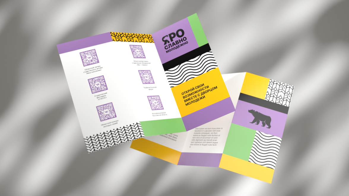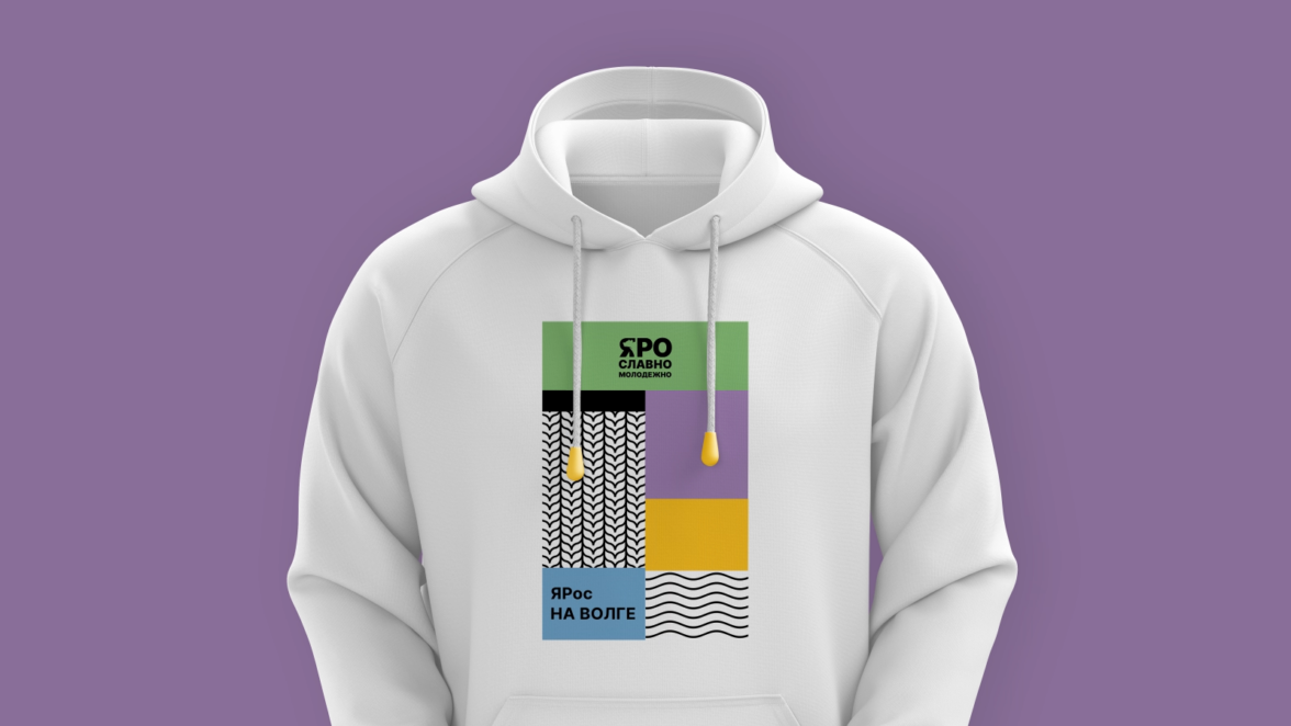 При выборе цветов было важно сохранять преемственность: желтый присутствует на флаге Ярославской области, поэтому он в палитре стал главным. К желтому для контраста добавили фиолетовый, зеленый, розовый и голубой.