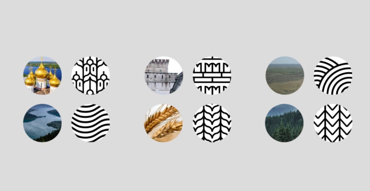 При разработке графических элементов мы обратились к списку ассоциаций, который составляли в начале работы над дизайном. Так, в основу паттернов легли купола, колосья, волны Волги, крепостная стена и поля — Ярославль славится сельским хозяйством.
