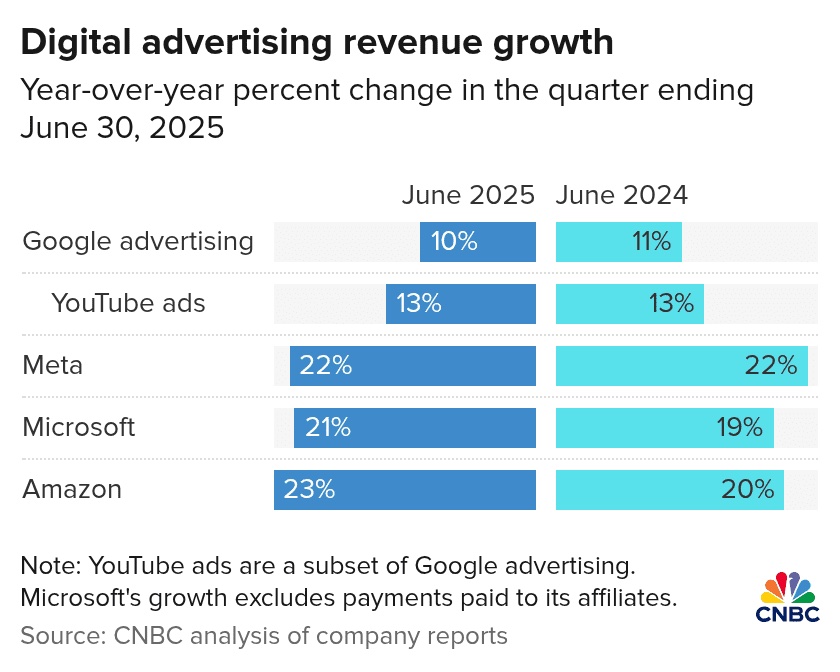Рост выручки ведущих технологических компаний от онлайн-рекламы в квартале, закончившемся 30 июня 2025 года. Выручка от рекламы в YouTube включается в общую выручку Google от рекламы. Из выручки Amazon исключены выплаты аффилированным структурам // Источник: анализ CNBC на основе финотчетности компаний
