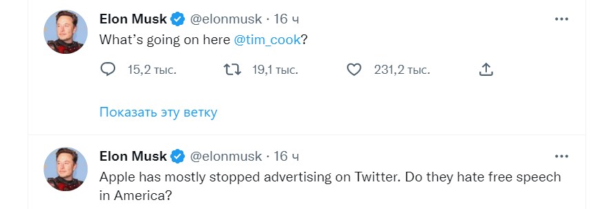 Маск озадачен, поскольку Apple не называет причины бойкота. В одном из семи сегодняшних монотематических постов он напрямую обратился к исполнительному директору Apple Тиму Куку со словами: «Что происходит»?