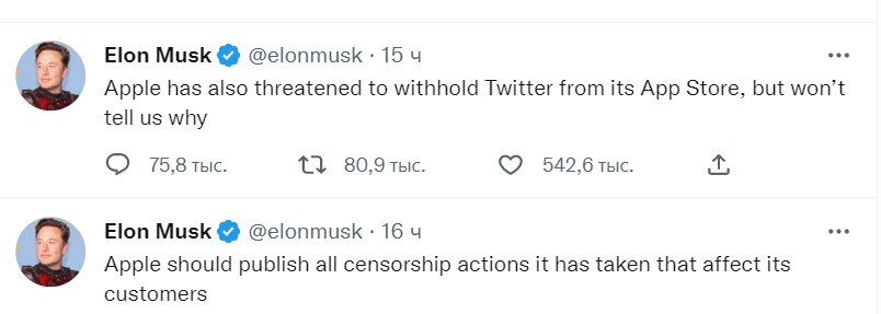 Twitter продолжает наживать могущественных врагов. Согласно заявлению Илона Маска, Apple угрожает убрать приложение социальной сети из App Store. До этого корпорация практически прекратила рекламироваться на платформе.