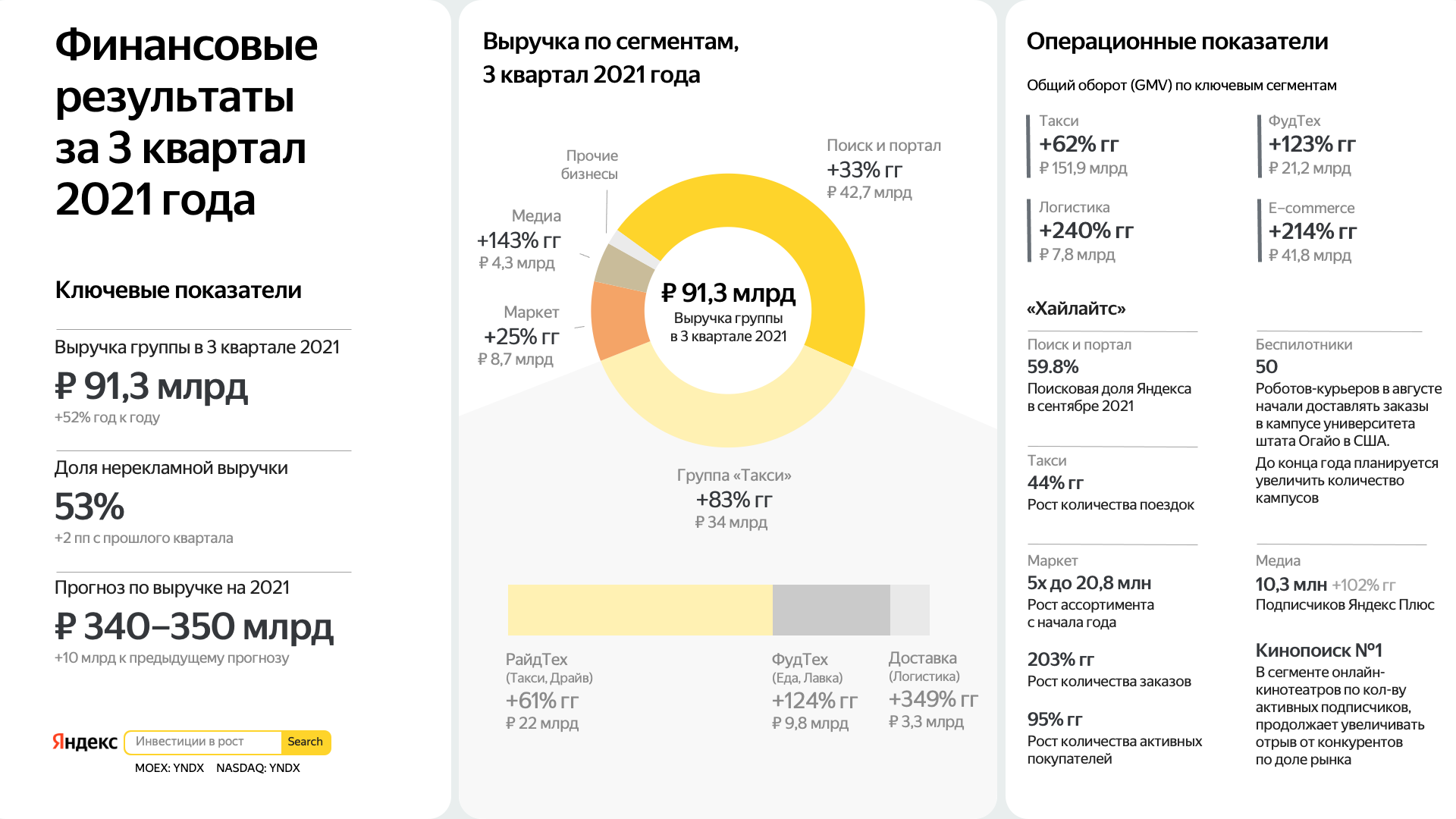 В компании зафиксировали рост сегмента «Поиск и портал». Выручка сегмента в III квартале достигла 42,7 млрд руб. (+33% год к году). В «Яндексе» объясняют эти показатели целевым инвестированием в развитие поисковых и рекламных технологий. По собственным данным, «Яндекс» сохранил долю на российском поисковом рынке — она составила 59,3%. При этом 66,2% всех поисковых запросов были сделаны со смартфонов. Мобильный трафик обеспечил 57,5% выручки от продажи рекламы на странице результатов поиска.