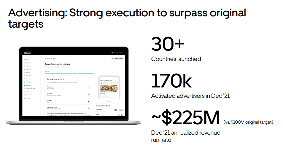 К 2024 году Uber планирует зарабатывать на рекламе $1 млрд. Эти амбиции небезосновательны — по итогам 2021 года продажи рекламы принесли Uber $225 млн при прогнозе $100 млн. Компания активно вкладывается в рекламу на своих платформах доставки, а также во флагманское направление — например, устанавливает специальные экраны в такси для просмотра рекламы. О рекордных рекламных заработках за прошедший год сообщил глава Uber Дара Хосровшахи во время конференц-колла с инвесторами и аналитиками.