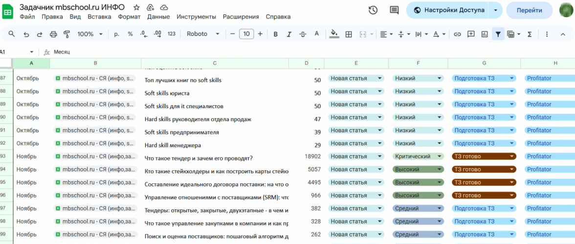 Этот документ стал источником истины и для команды, и для заказчика, практически полностью автоматизировав рутинные согласования. Клиент размещает готовые материалы, данные по трафику заносятся в задачник для оценки эффективности каждой статьи.
