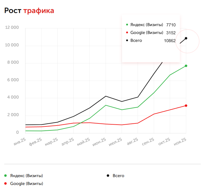 После внедрения новой системы и начала публикации статей, созданных с помощью ИИ, трафик показал устойчивую положительную динамику. С января по ноябрь 2025 года количество визитов выросло в 11,4 раза — с 963 до 10 991.