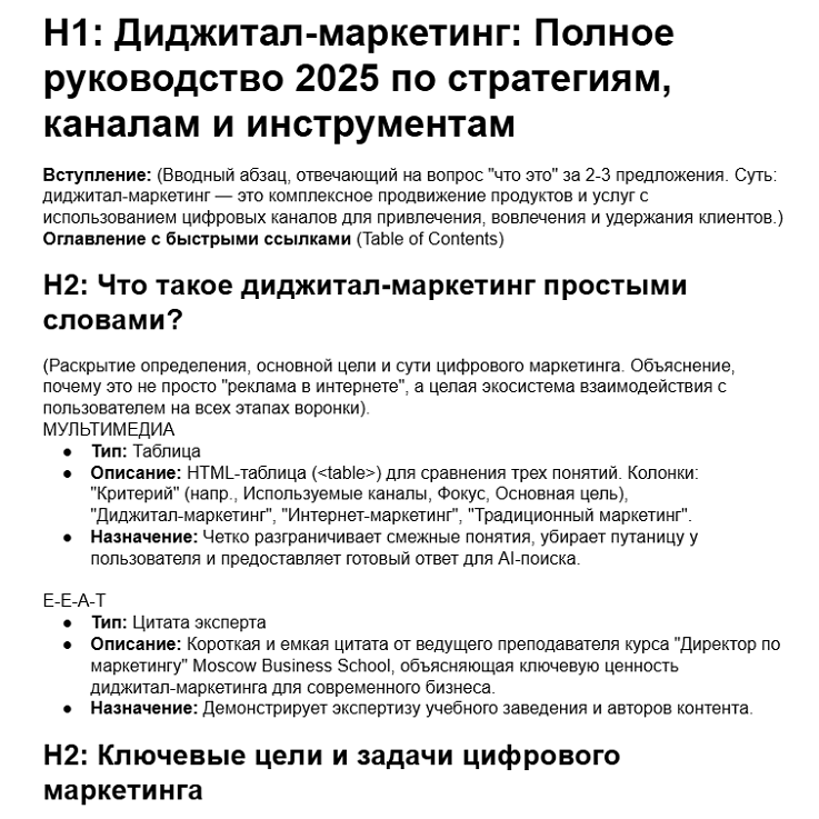 Мы внедрили двухуровневый процесс создания статей с помощью ИИ: для высокоприоритетных (ВЧ) запросов нейросеть создавала подробную структуру для последующей глубокой доработки редактором. Вот ее отрывок: